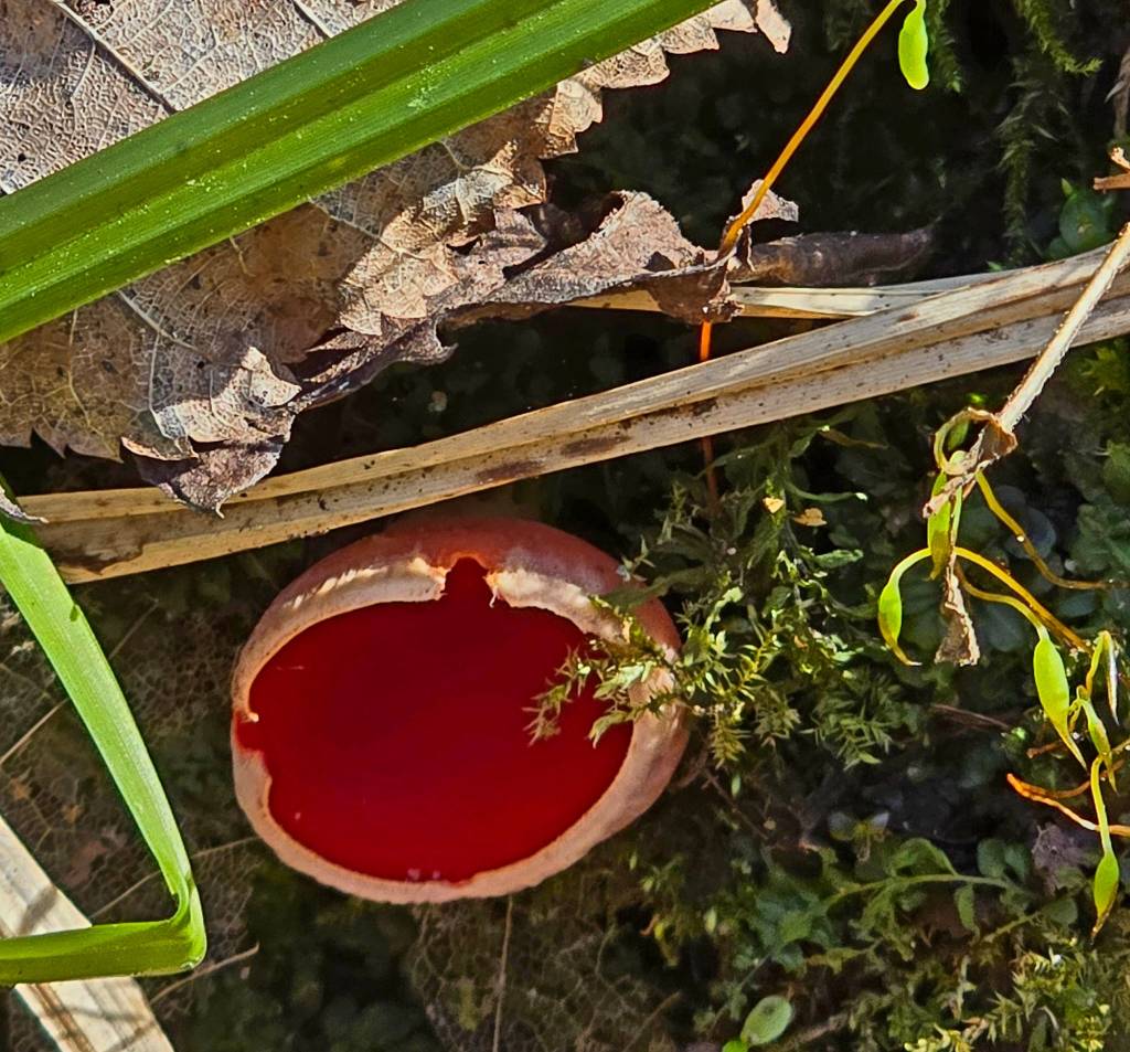 A burst of red from a Scarlet Elf Cup might be a sign of vitality, of life insisting on beauty even in decay.